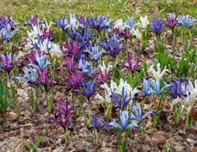 4-6” tall plants with blue, white, and purple flowers blooming in sequence in March. Plant in well-drained soil and full sun, and it likes to be dry in summer. The bulbs perform best if planted with points up.