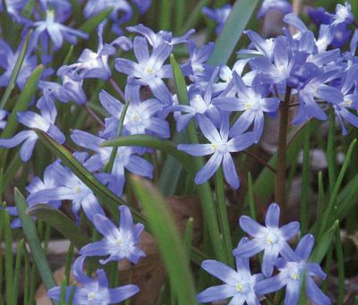 5-6” tall plants with blue flowers in late March. Plant in full sun or partial shade, in well-drained soil that is not too dry. If left undisturbed, the bulbs may seed themselves about, eventually forming a thick lavender-blue carpet in spring.